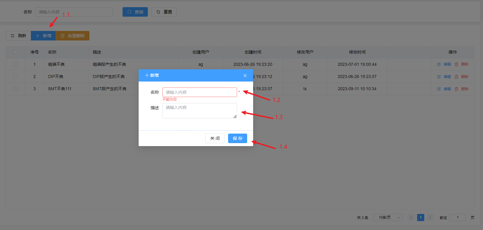 点击新增按钮(1.1)填写不良类型名称(1.2)填写不良类型描述(1.3)设置完成后点击保存按钮(1.4)