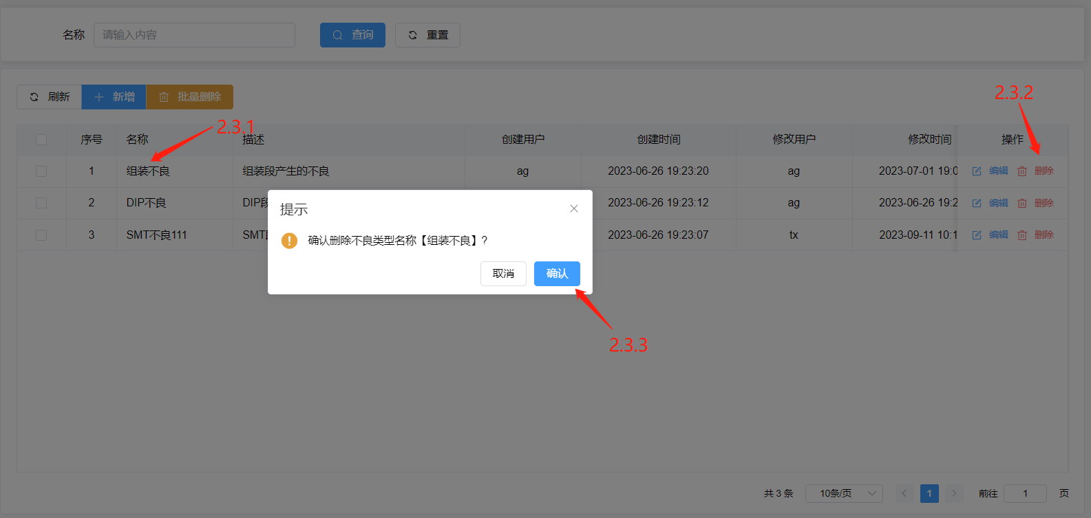选中需要删除的不良类型(2.3.1)点击删除按钮(2.3.2)点击确认进行删除不良类(2.3.3)