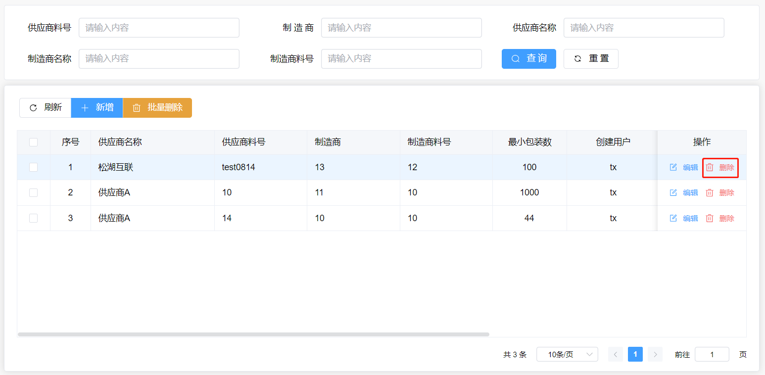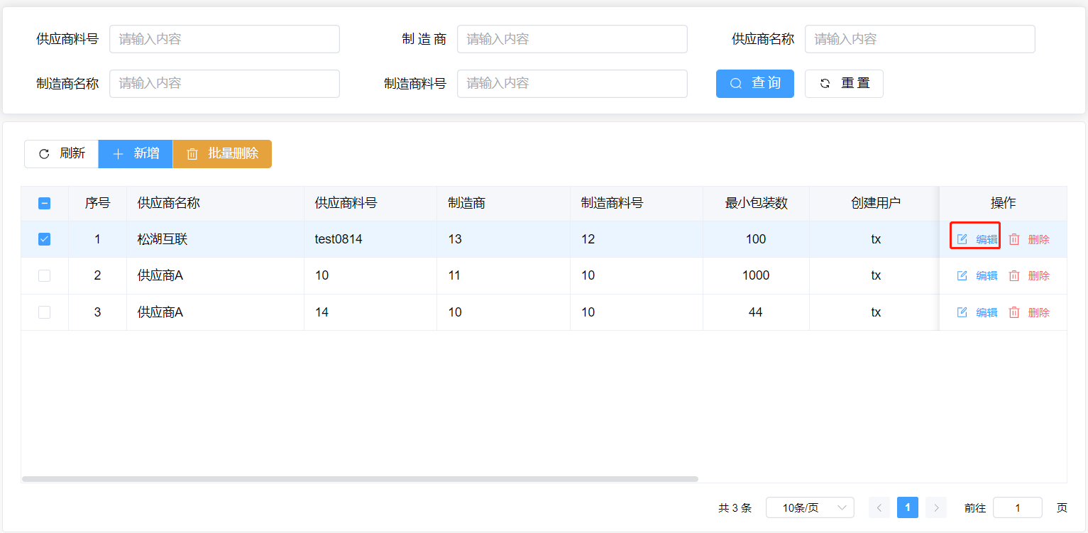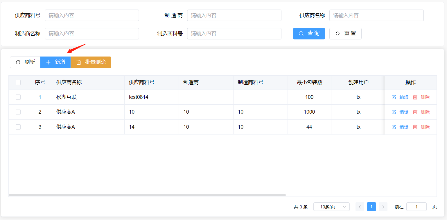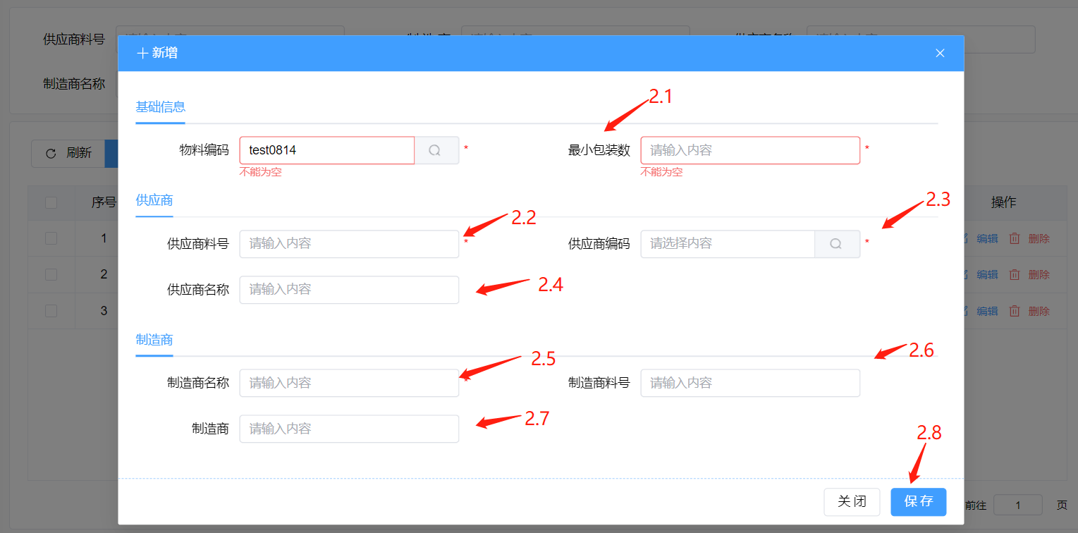填写最小包装数(2..1)填写供应商料号(2.2)选择供应商编码(2.3)填写供应商名称(2.4)填写制造商名称(2.5)填写制造商料号(2.6)填写制造商(2.7)点击保存(2.8)