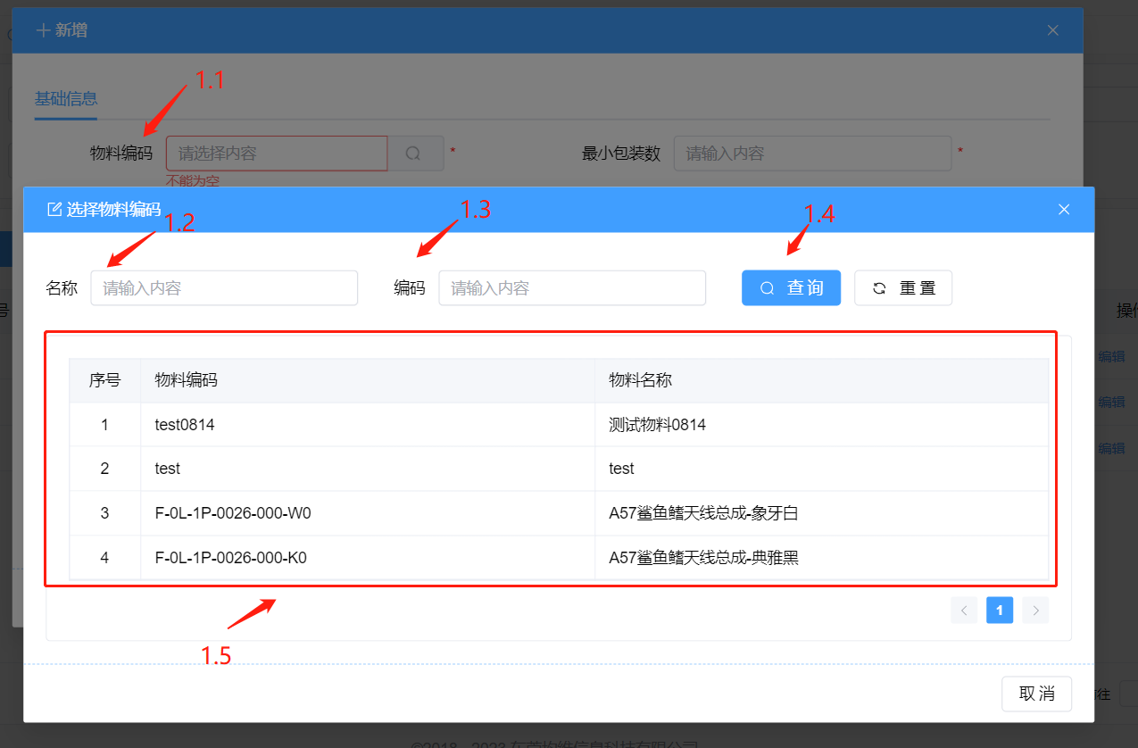 点击物料编码进行查询(1.2)填写物料名称(1.2)或物料编码(1.3)进行查询(1.4)在(1.5)框中选择需要维护的物料