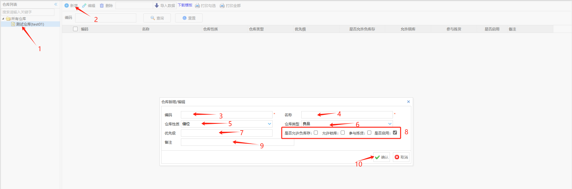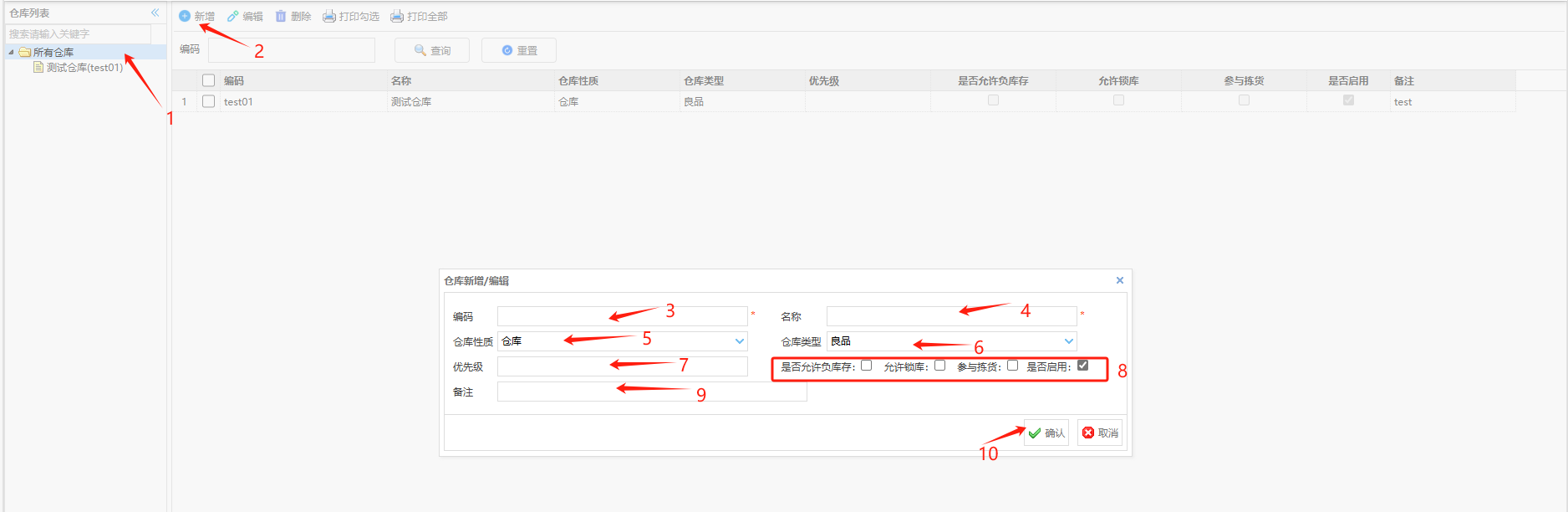 8、选择是否负库存,选择是否允许锁库,选择是否拣货,选择是否启用;
