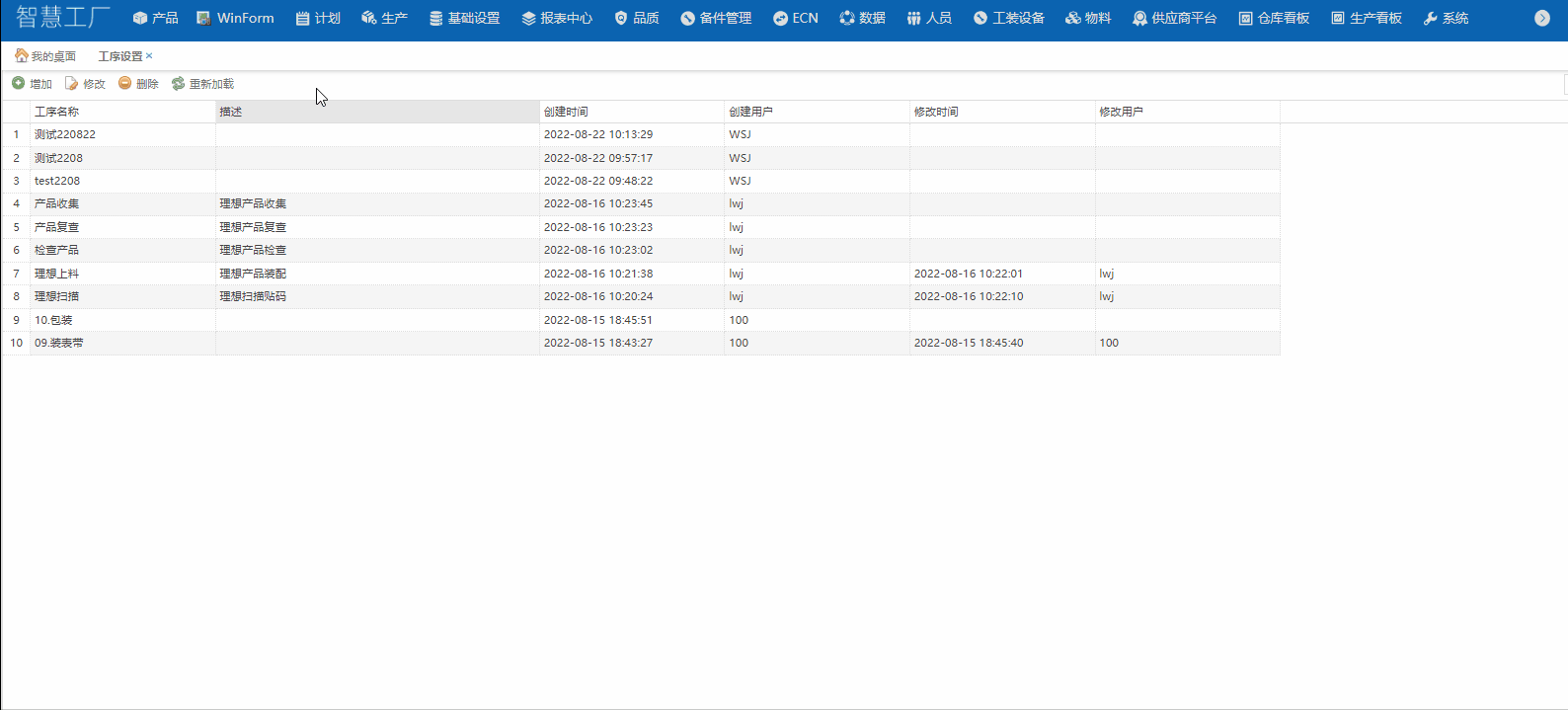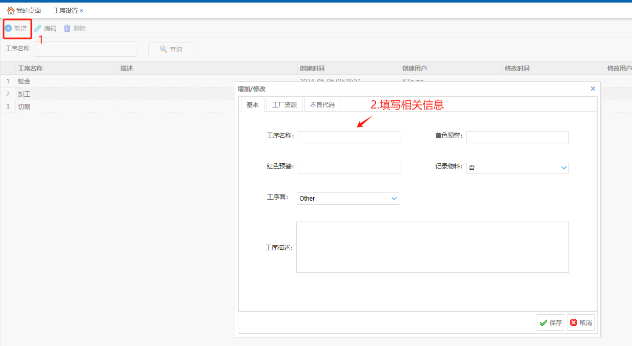 在工序设置页面可以对相应工序进行新增、编辑和删除操作。以下为工序操作内容。