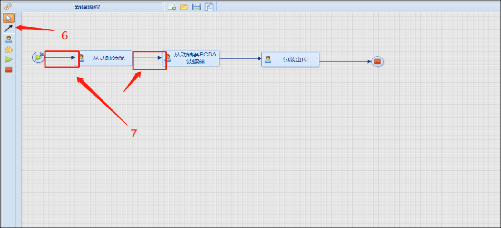 连线具体操作:鼠标点击选择连线功能后,点击选中前一工序名,按住左键拖动线连接一下工序名。