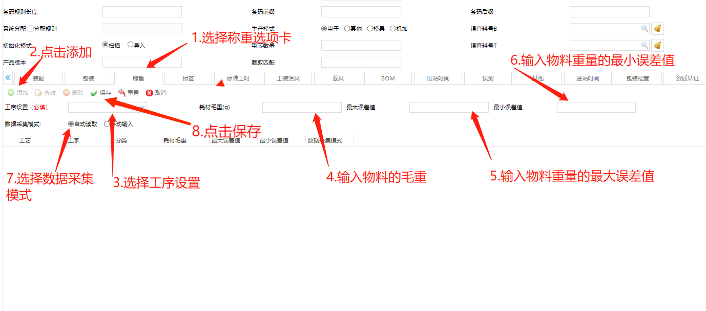 b.数据采集模式:分为自动读取和手动输入读取方式,自动读取需要电子秤支持COM口传输方式