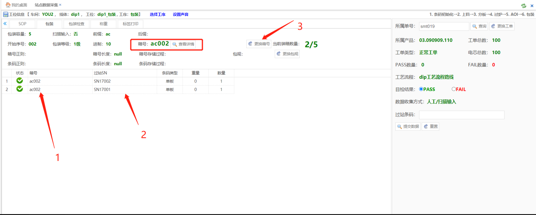 a.在过站条码录入过站条码后,如左下图所示【1】为箱号,是在产品维护中设定好的箱号规则来的【2】