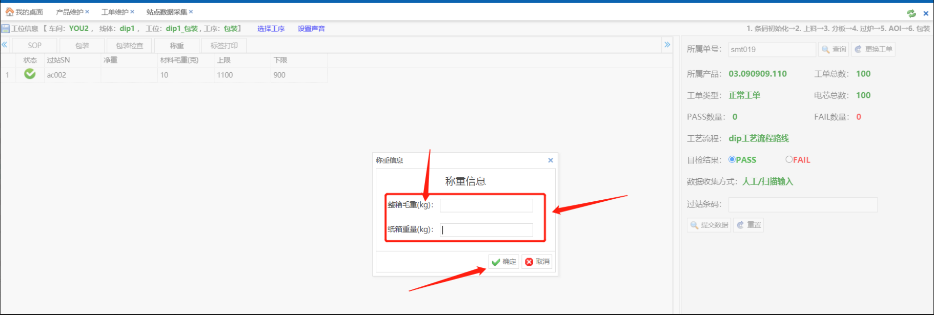 b.包装装箱过站完毕后就到称重,(此处是手动录入操作)录入相应的称重值即可,此处单位为【KG】需要做转换,录入完毕点确定即可