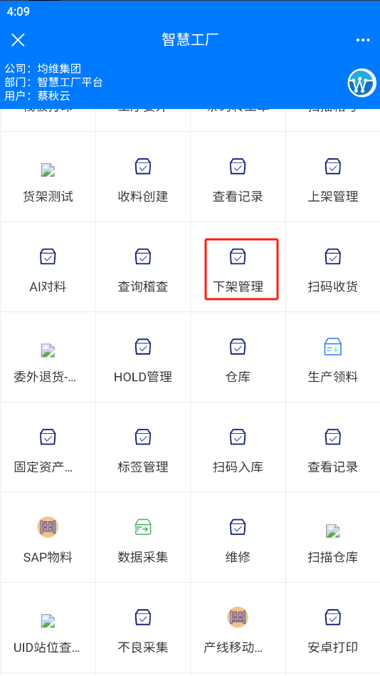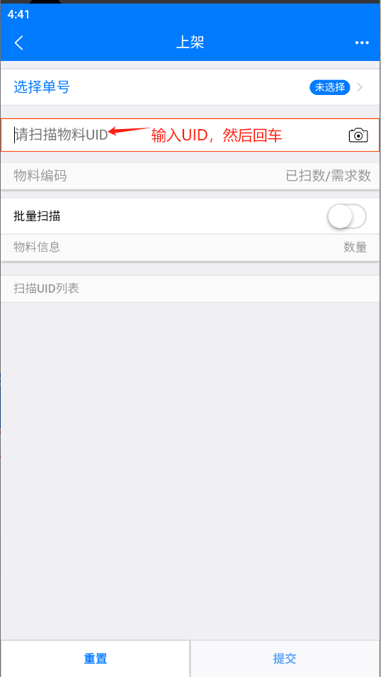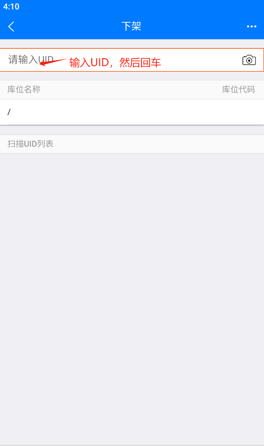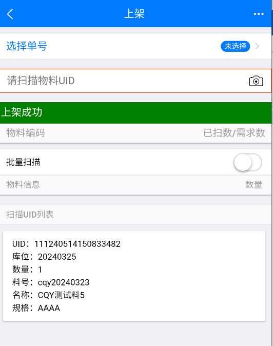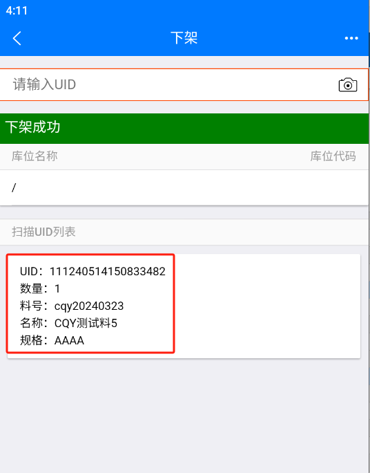 下架操作:扫描需要下架的物料UID,不需要提交,自动下架,只需扫描