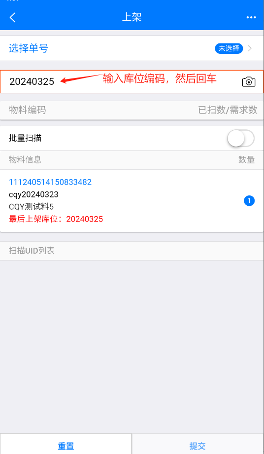 先输入物料UID,然后回车。在输入库位编码,然后回车