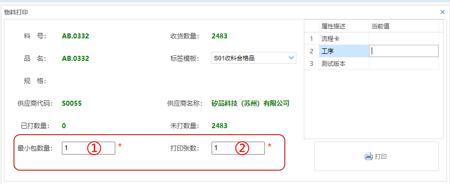 填入打印的 ①最小包数量 ②张数