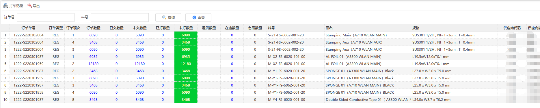 支持采购订单号/供应商 ERP单号查询