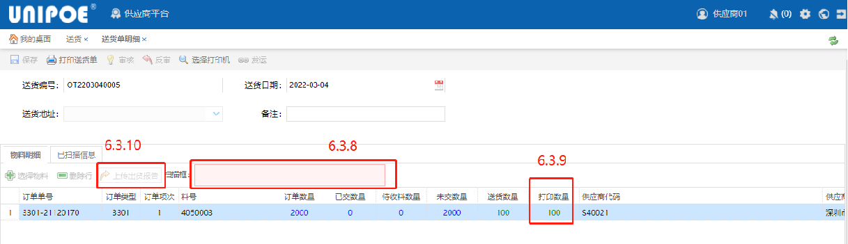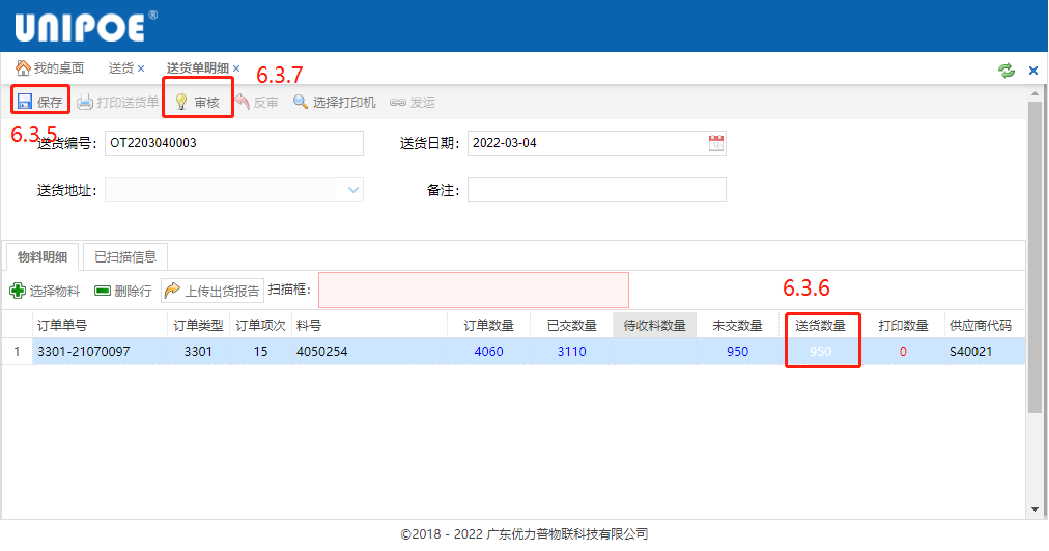 点击“送货数量”(6.3.6)修改送货的数量,完成后点击“审核”(6.3.7)