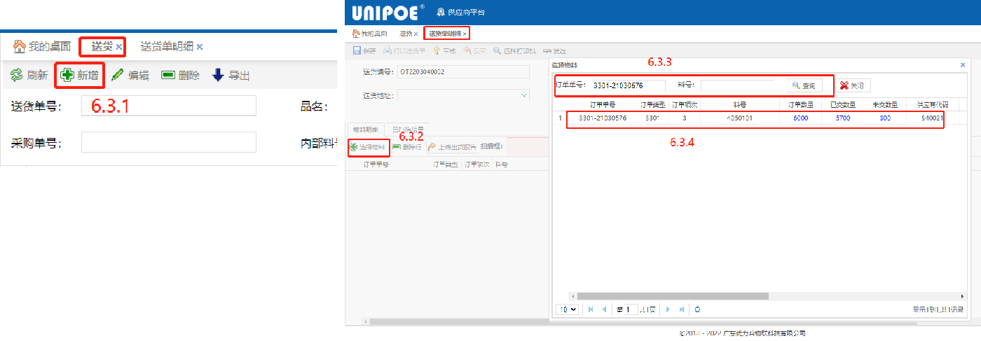 点击“选择物料”(6.3.2),输入订单单号、料号,点击查询(6.3.3),