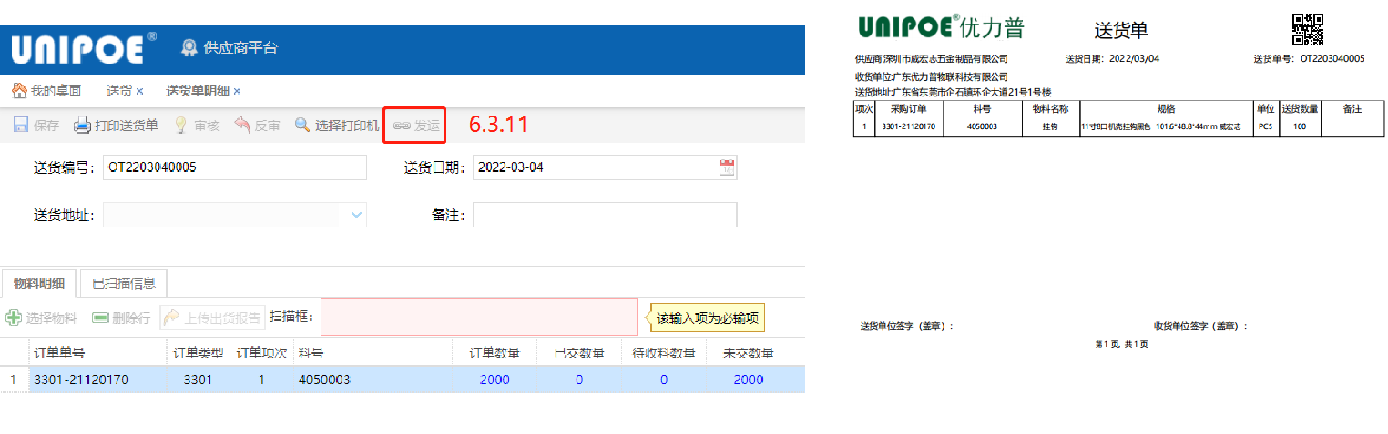 最后点击“发运”(6.3.11)系统自动链接打印机,打印送货单