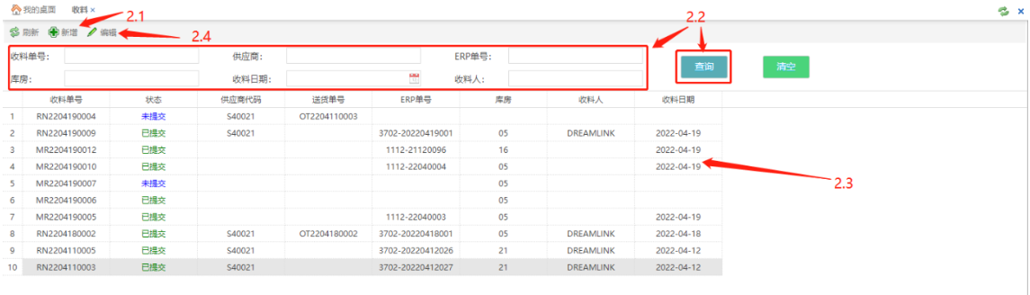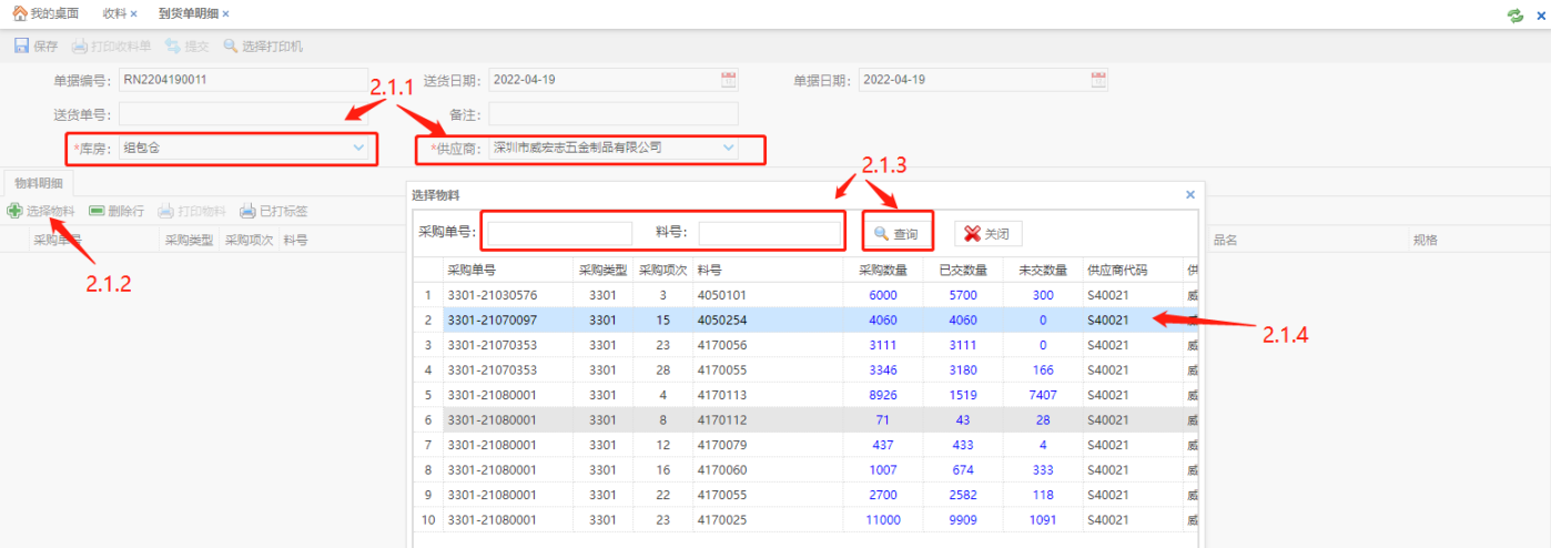 查询收料单:填写查询字段信息,点击【查询】按钮(2.2),即可在下方查询已有的收料单信息;