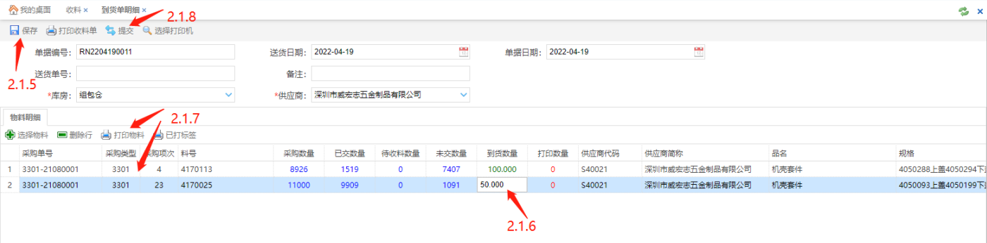 选择好物料后点击【保存】按钮(2.1.5),选择物料双击(2.1.6)填写到货数量,选择物料点击【打印物料】按钮打印物料标签(需开启均维打印服务控件),如果已经打印过需补打可以点击【已打标签】补打标签,点击【提交】即可同步ERP。