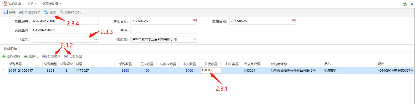 进入收料编辑界面,选择库房,可以根据实际情况编辑到货数量(2.3.1)、打印物料标签或补打已打印标签(2.3.2),点击【提交】(2.3.4)按钮同步ERP。
