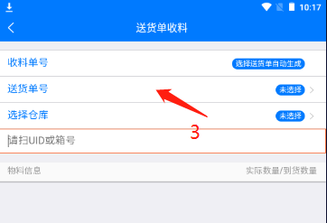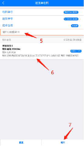 选择【收货】(1),再选择【送货单收料】(2),在送货单收料界面点击【送货单号】进入单据选择界面(3)选择单据(4),在收料界面扫描收料UID条码(5)并核对收料信息(6)无误后点击【提交】即可完成收料(7)。