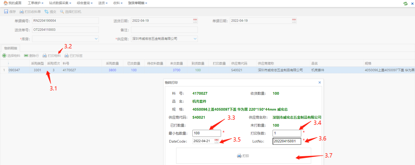 选择物料(3.1)点击【打印物料】打印物料标签(3.2),填写最小包数量(3.3)、打印张数(3.4)、DateCode(3.5)和LotNo(3.6)点击【打印】(3.7)(需开启均维打印服务控件)。