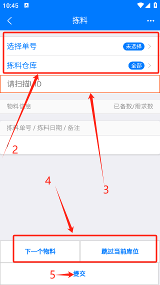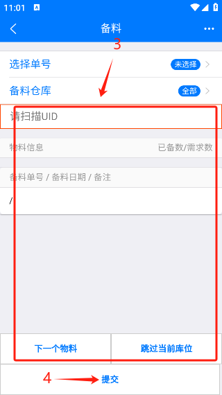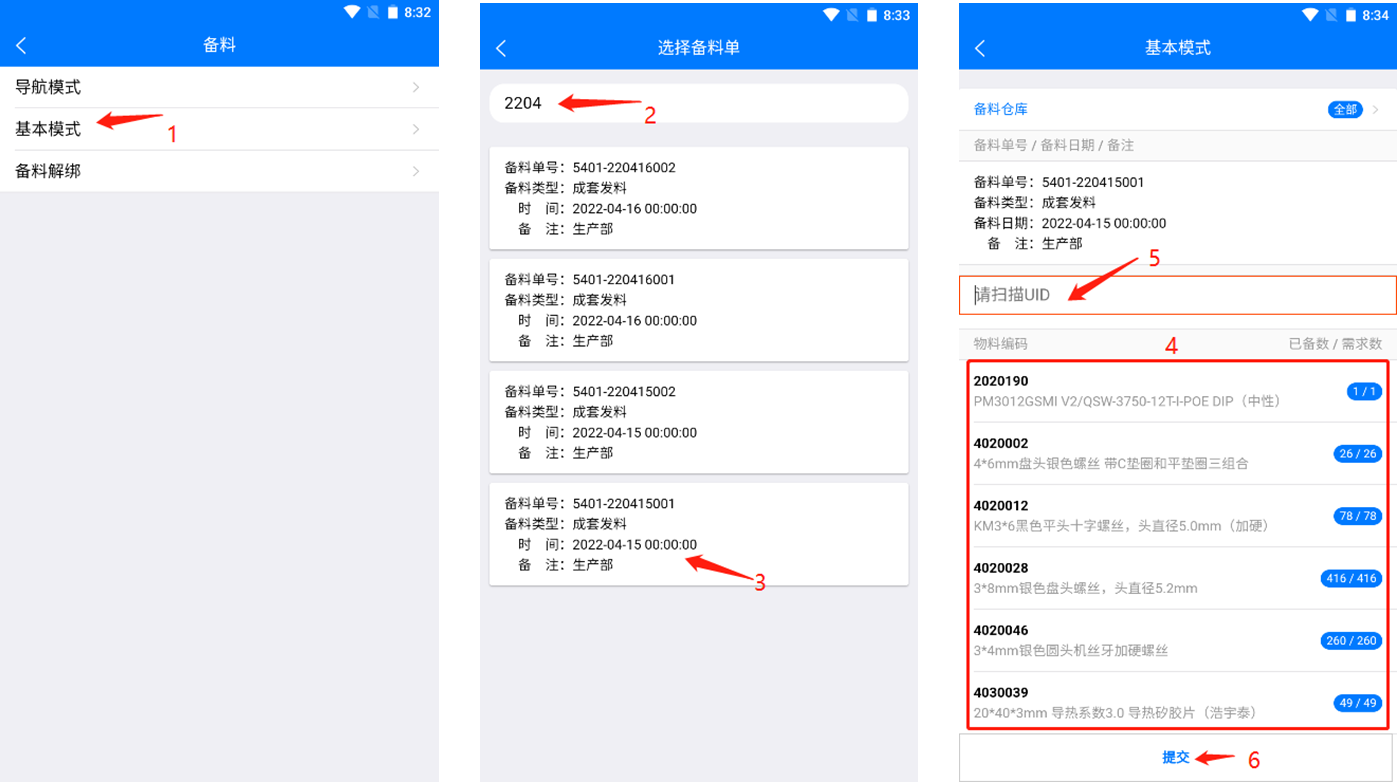 选择【基本模式】(1),搜索工单/备料单号(2),点击选择备料单(3),根据依次扫描物料(4),全部扫描完成后点击【提交】(6)即可完成备料