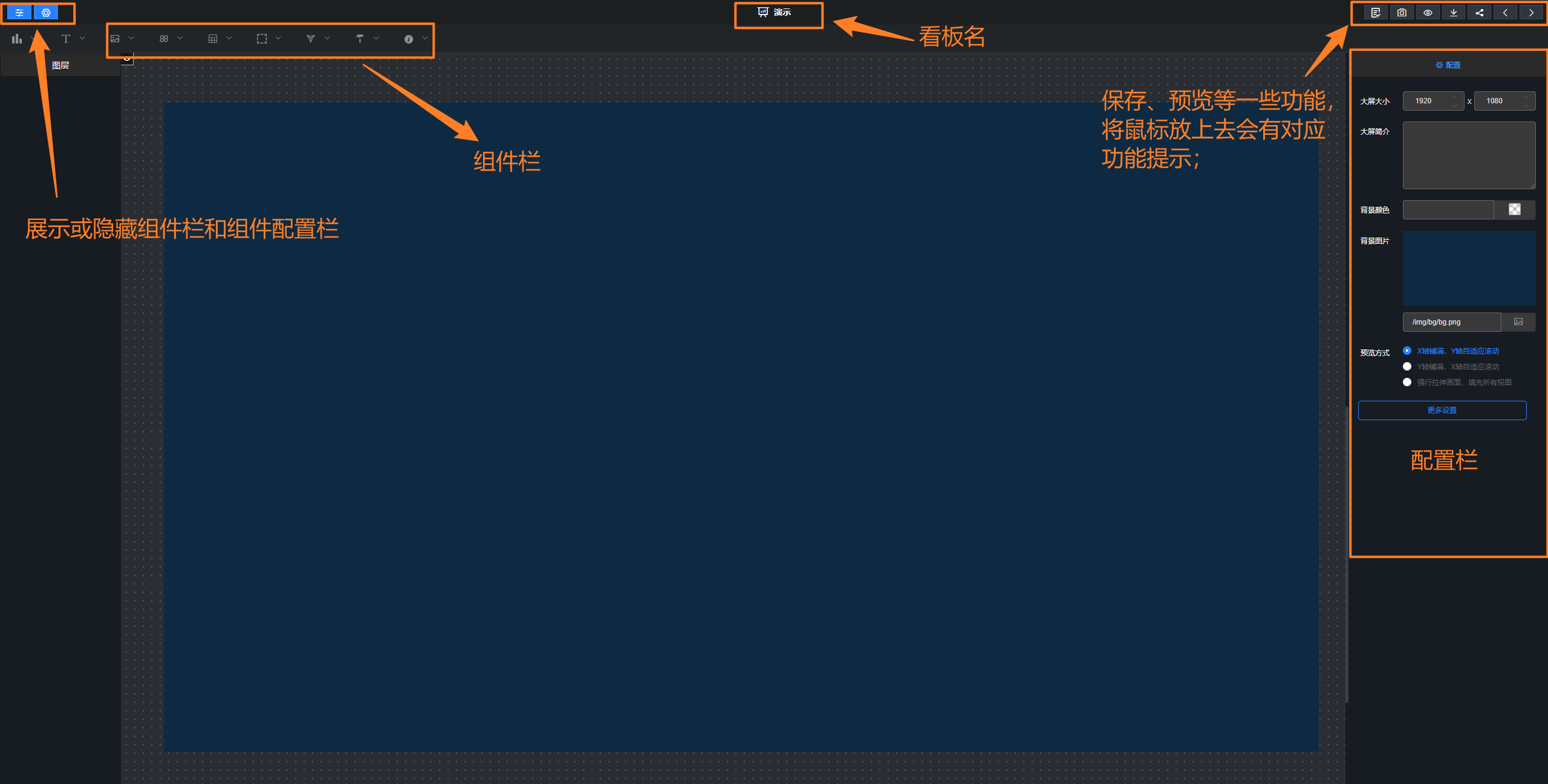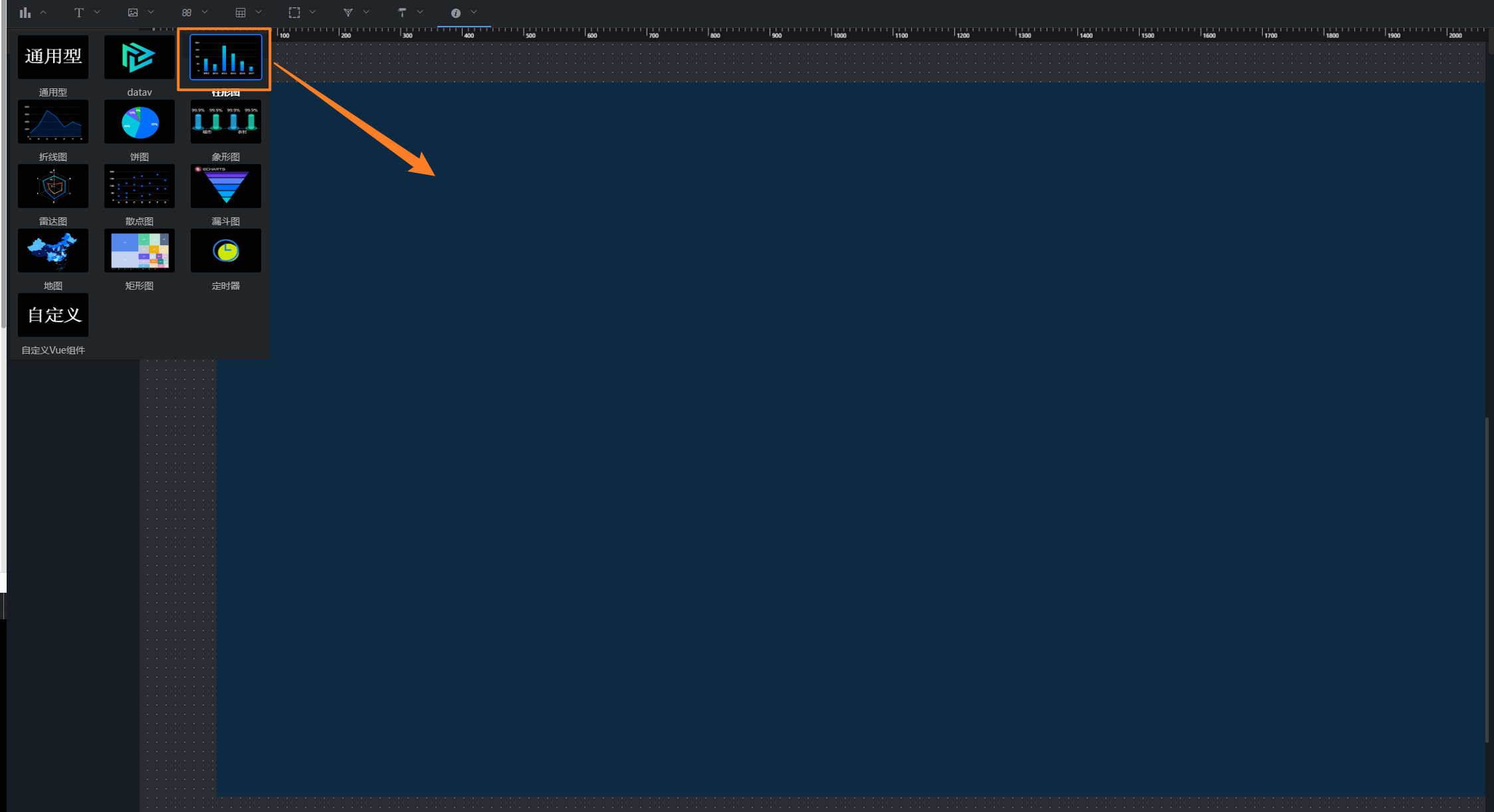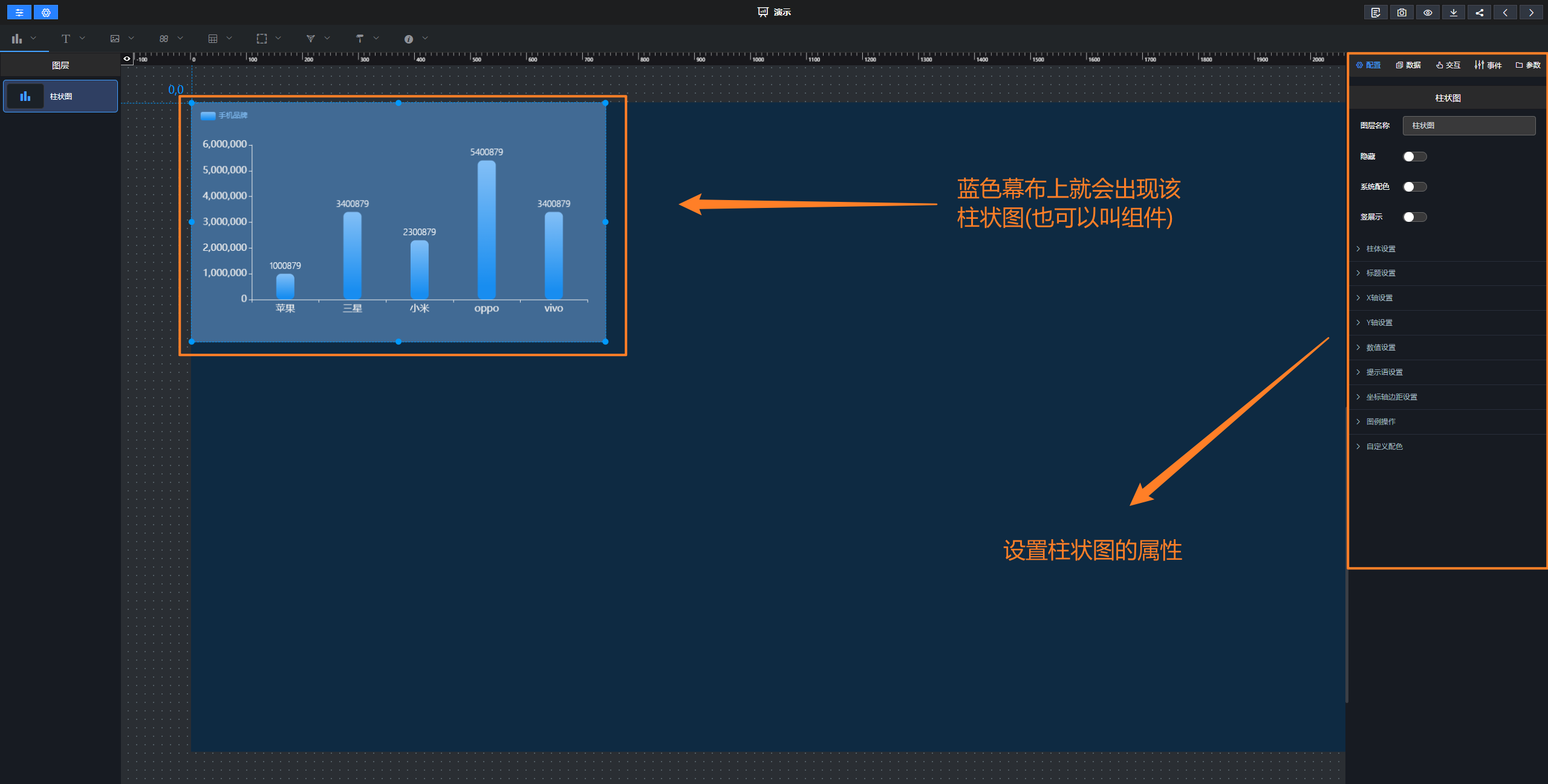 新建空白大屏一、框架的基础认识1、新建 2、填写信息 3、页面的基本功能简述 4、组件栏 选中将其拖拽到蓝色幕布上,将会得到下图,属性相关的具体操作在综合功能的文档有说明,这里暂时演示- 一个柱状图的功能; 二、从零生成页面 目标,生成如下页面: 作者:李佳霖 创建时间:2023-03-09 14:04最后编辑:李佳霖 更新时间:2025-05-22 17:41
