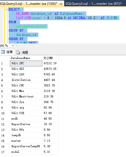 CAST(SUM(size) * 8 / 1024.0 AS DECIMAL(10,2)) AS 大小MB
