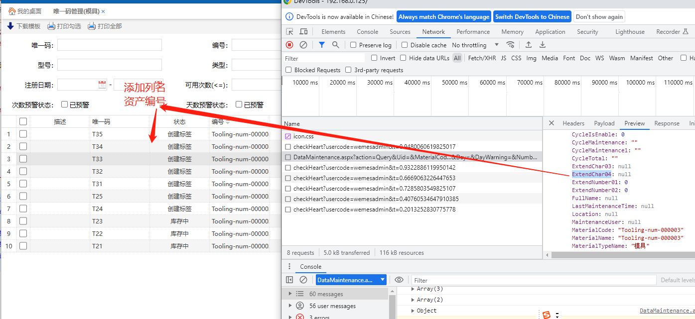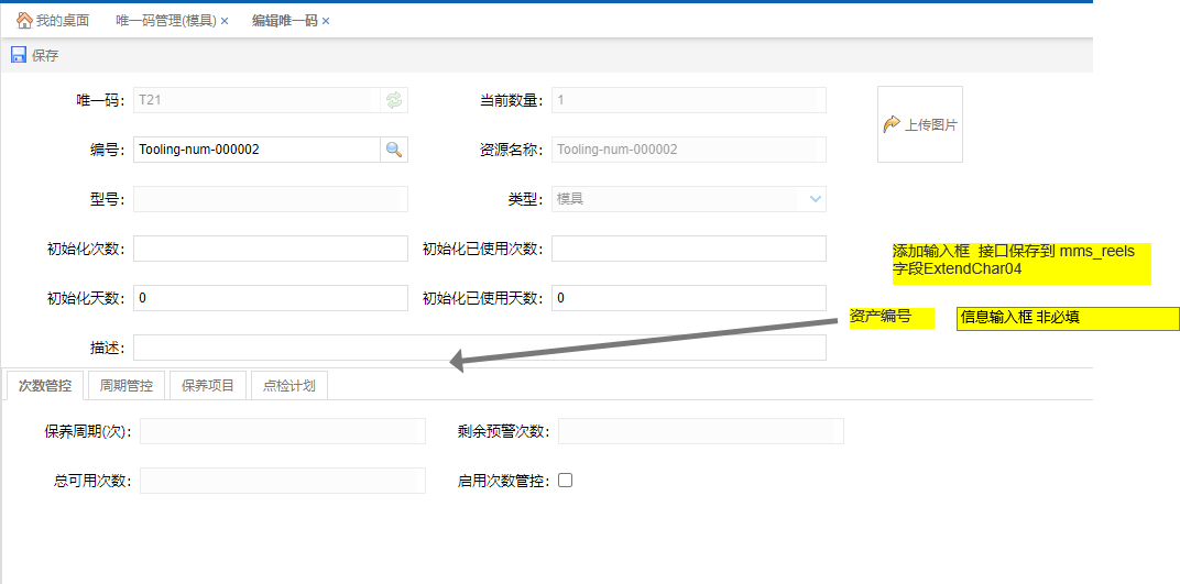 1 工装唯一码页面:添加显示资产编号(数据库reels 表ExtendChar04)和UOM_name (名称和数据库相同)接口地址,http://192.168.0.125/Content/toolingmanagement/DataMaintenance.aspx?action=Query&Uid=&MaterialCode=&MaterialName=&Model=&MaterialType=&State=&StartCreateTime=&EndCreateTime=&Number=&Day=&DayWarning=&NumberWarning=&uname=wemesadmin