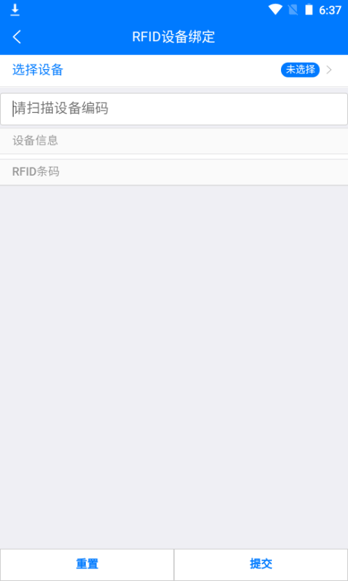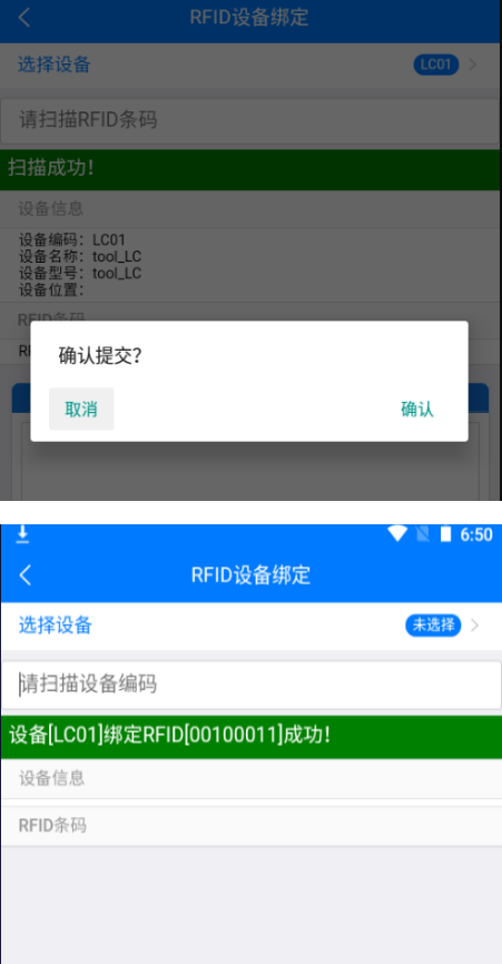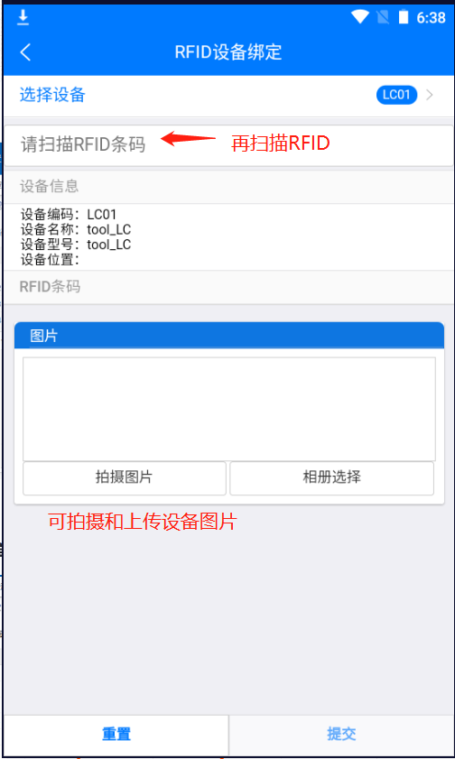 | 登录账号 | 进入资产管理 | 进入绑定RFID | 先扫描设备唯一码 | 再扫描RFID 上传图片 | 再扫描RFID 上传图片 |