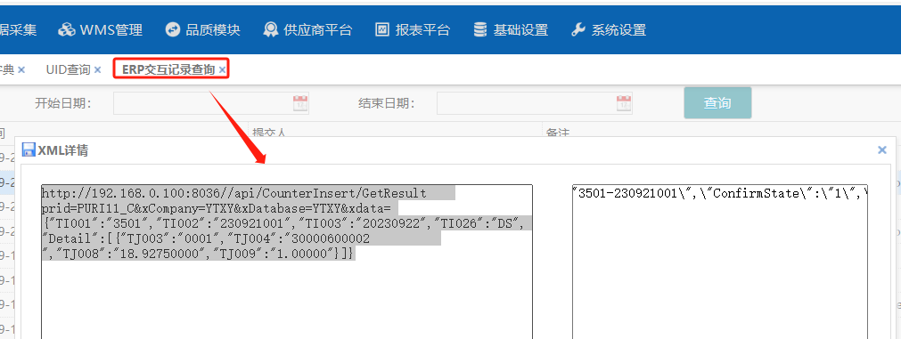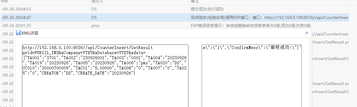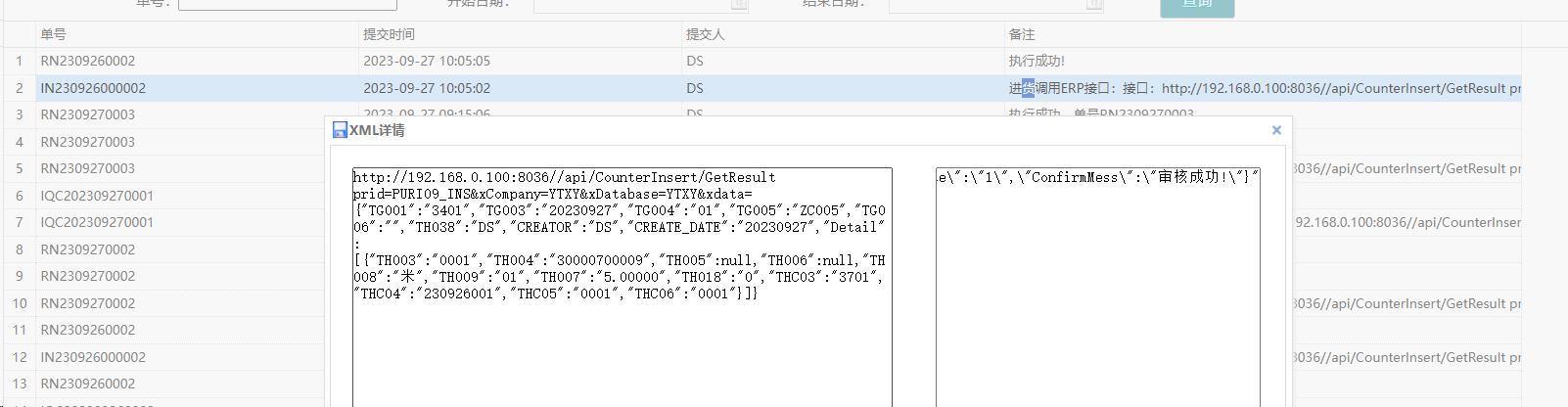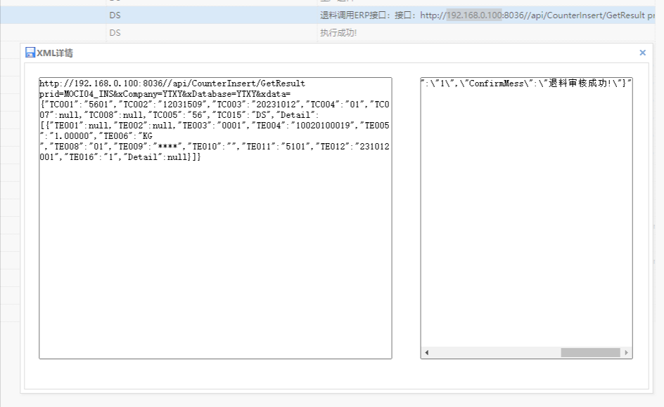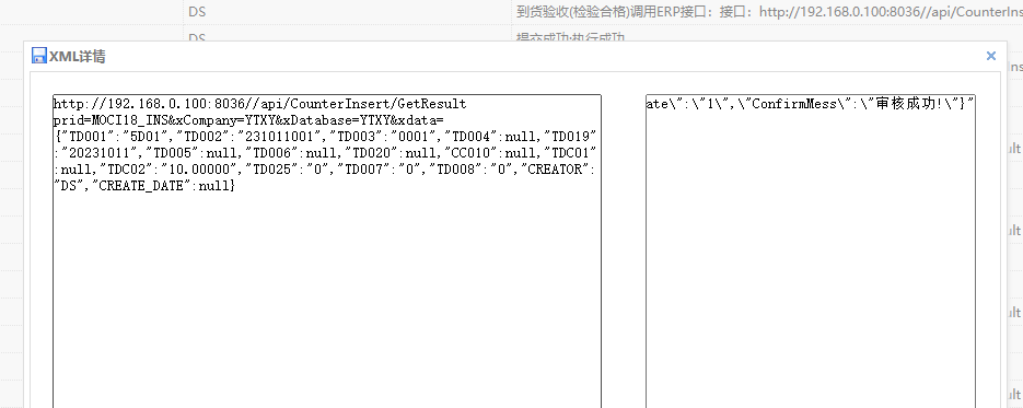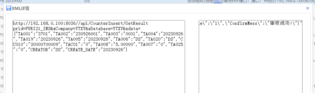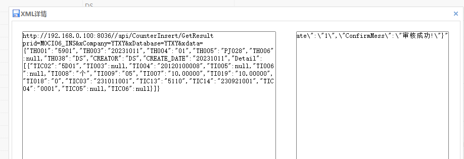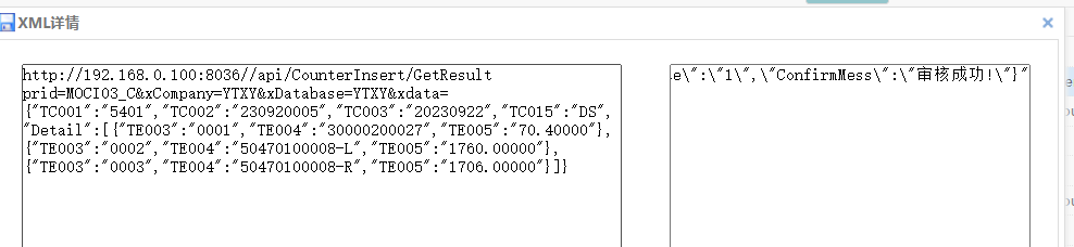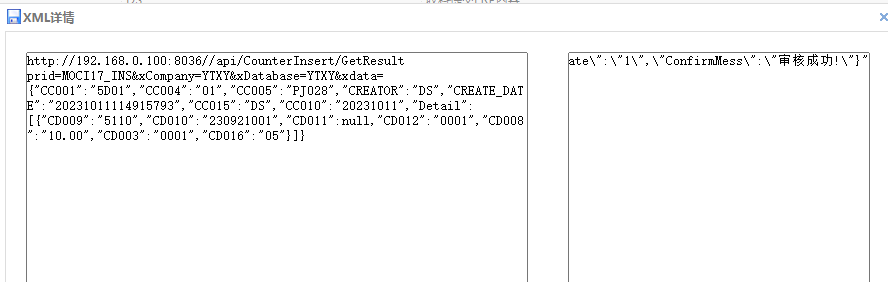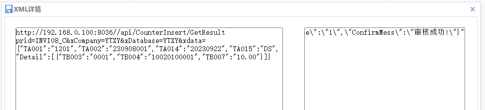 http://192.168.0.100:8036//api/CounterInsert/GetResult prid=PURI11_C&xCompany=YTXY&xDatabase=YTXY&xdata={"TI001":"3501","TI002":"230921001","TI003":"20230922","TI026":"DS","Detail":[{"TJ003":"0001","TJ004":"30000600002 ","TJ008":"18.92750000","TJ009":"1.00000"}]}