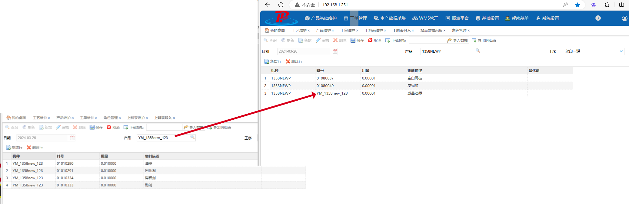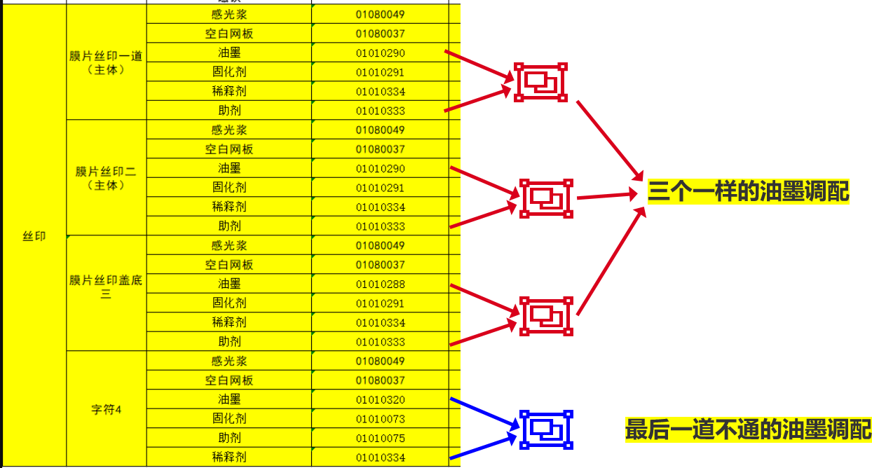 为适应现场生产特点模式的原理 本模式为第二版本的油墨调配指导举例1358的 丝印工艺 此产品的丝印一二三 油墨料号和配比都相同 可以使用相同油墨半成品 第四道油墨不同 使用单独的半成品 油墨半成品创建 操作视频油墨调配和使用系统维护部分.mp4 油墨调配油墨房和生产部分.mp4附件油墨调配油墨房和生产部分.mp4油墨调配和使用系统维护部分.mp4作者:潘茂盛 创建时间:2024-03-25 23:29最后编辑:潘茂盛 更新时间:2025-05-09 11:58