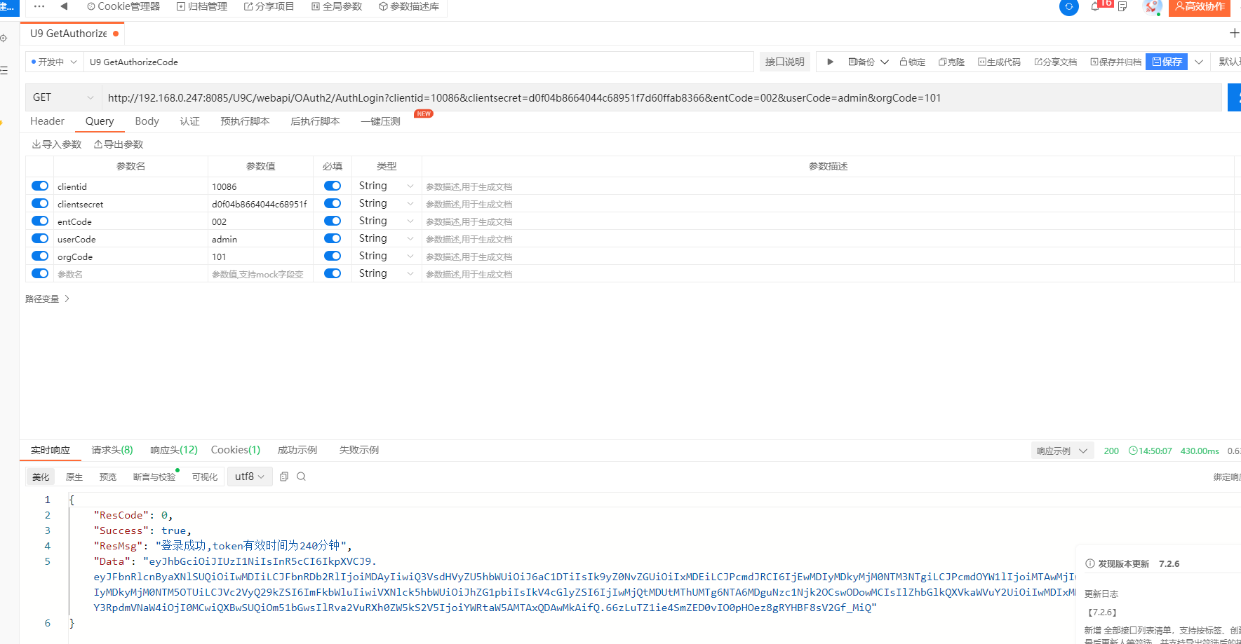 例子http://localhost/u9c/webapi/OAuth2/AuthLogin?userCode=demo&entcode=001&orgcode=001&clientid=API1&clientsecret=36462bf7ecf74edd8bfadbb7b71a6607 获取token http://192.168.0.247:8085/U9C/webapi/OAuth2/AuthLogin?clientid=10086&clientsecret=d0f04b8664044c68951f7d60ffab8366&entCode=002&userCode=admin&orgCode=101 查询ID作者:潘茂盛 创建时间:2024-05-18 14:30最后编辑:潘茂盛 更新时间:2025-05-09 11:58