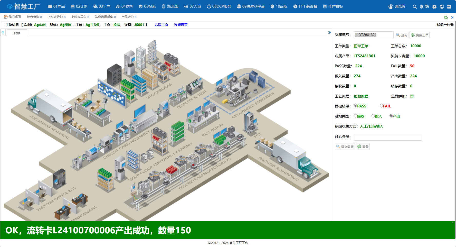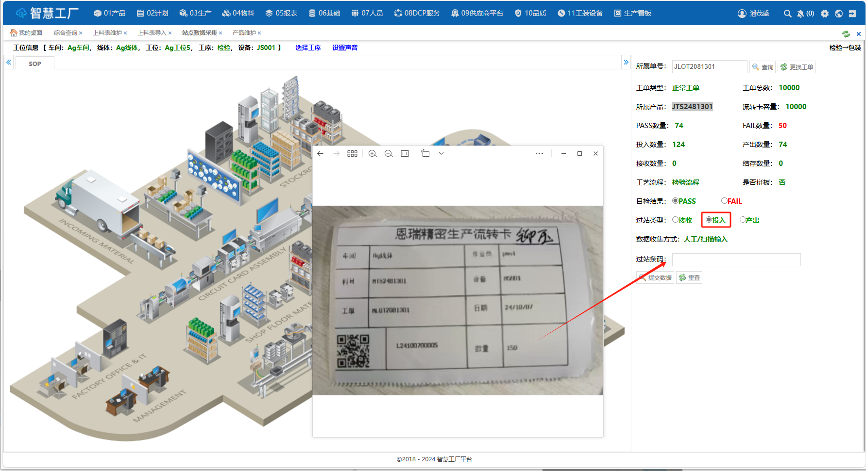 说明:扫描[冲压]工序产生的流转卡进行投入,然后输入数量进行产出打印流转卡