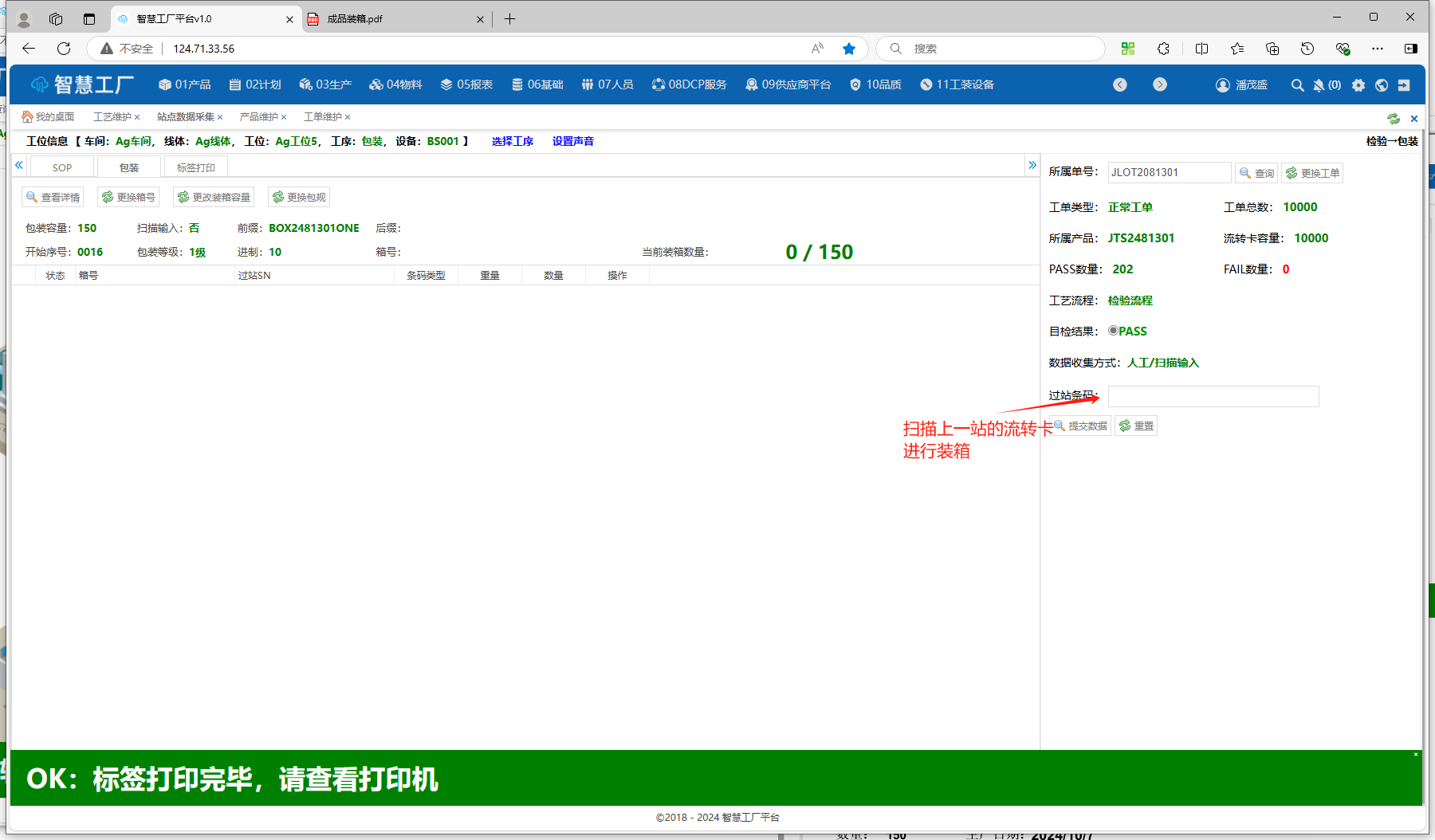 说明:扫描[铆压]工序产出的流转卡进行检验和包装,产出箱号标签