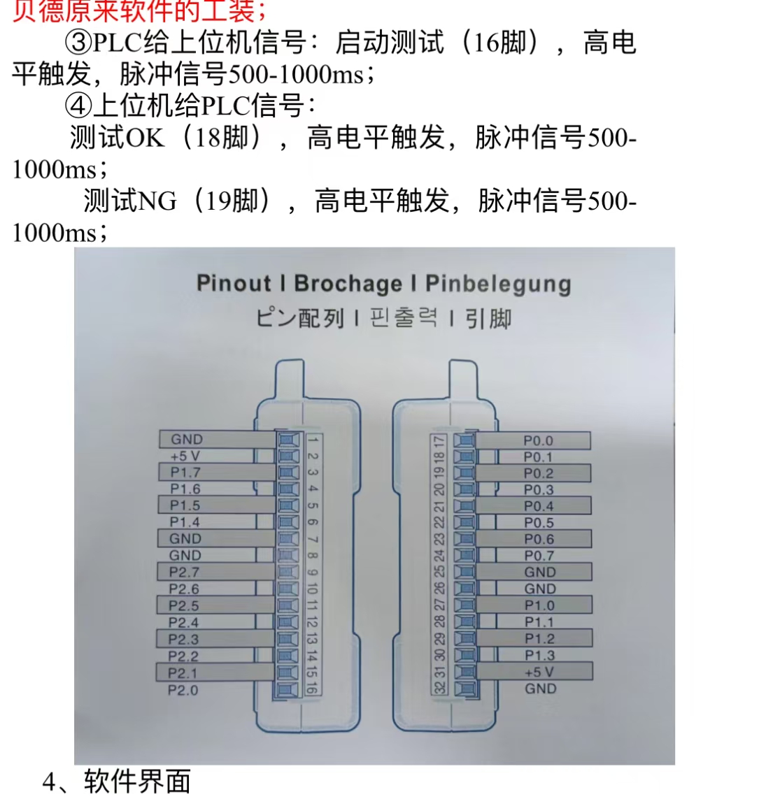 目录 搜索 展开 项目总览ZABBIX项目跟踪系统思维建议实施资源调配mindoc哨兵系统目录shell运维工具APIpost测试系统BUG查询海业创兴设备对接海格森接口TEST过站存储过程绑定存储过程海业贴标机对接方案海业创兴SMT工时海业AOI自动解析海业工时报表软著和专利ZXBT上料表首站亮灯记录UID盘点记录李然 PCK工装PCK 工装管理修复问题点230508移动货架兆兴博拓条码长度货架等色查询贴标机对接工装智能料架管理工单上架亮灯信佳电子镭雕贴标机对接上料VPN连接810备料设备点检问题跟踪系统雅晶源PCB绑定外壳流程优化维修流程优化IPQCIQC测试数据雅晶源收尾2024A客户设备镭雕ASSA亚萨RFID关系优化项1优化8-15调研确认点1优化项2亚萨资产盘点操作指导优化3FRP客户端1mindoc服务器维护0.47服务器英特兴业初始菜单数据库同步工艺_产品_工艺路线视图优化点紧急BUG接口开发生产退料iqd-file库存交易单六项精进耀登AUDEN_VN MES系统培训文档audenvoide资质认证dockerPDA调用局域网打印机罗姆斯git江西华派项目接口测试机加化工优化点华派操作文档PDA安装程序华派生产查询 视频工程准备和计划清单仓库部分报表查看综合查询联产品工艺流程和工单设置系统工程师维护信息油墨调配和核对第二版结案调优以及疑问解答05条码完成工序报表增加的华派计算投入产出点数据设置打印机设置建盛荣业操作文档标签测试对照标签模版建盛荣业更新进度建盛箱号存储过程bartenderWMS和bartender标签设计PYS鹏元晟项目软件实施计划1 视图携客云在线文档1 PDA安装PDA一体机打印标签U9 携客云U9测试视图采购计划视图携客云测试环境录屏鹏元晟WMS操作培训IQC检验标准仓库物料标签打印杂收流程生产领料一体机自动分盘设置导入领料转生产出货单完工OQC检验和入库调拨操作收货打印标签和IQC杂收流程先进先出管理PYS一体机更新打印速度合并领料测试盘点操作记录IQC超时处理采购订单超12个月处理处理入库异常收货携客云收货内部打印IQC检验操作PO入库生产退料仓库退货销售退货有效期预警成品出货数据库命令出货越南合并领料PYS维保事项BUG处理售后记录浏览器打印问题一体机兼容测试new国丰达RFID恩瑞精密先驱硬件方式二接线方式241218索拉老化数据采集设备对接win11 菜单经典北天MES操作文档北天优化计划北天报表锁表优化bartender精电设备报警器接线硕贝德LCRLCR上线DW工厂静电检测项目系统规划图采集器安装手环安装ESD模块调试技术篇(内部资料)数据库查找存储过程finddb五阳项目数采尚远项目尚远制程参数过站条码测试lingspd越南8SHUB操作说明智能报表饼图 暂无相关搜索结果! 阅读次数:114 本文档使用 MinDoc 发布 LCR NI控制板 测板 测板 提示 说明 16脚 P2.0 SW8按键 LED1 释放高电平灯灭按下低电平亮灯 18脚 P0.1 LED8 LED8 输出高灯灭输出低亮灯 19脚 P0.2 LED5 LED5 输出高灯灭输出低亮灯 作者:潘茂盛 创建时间:2024-11-21 19:33最后编辑:潘茂盛 更新时间:2025-05-09 11:58 ©2018 - 2023 智慧工厂平台
