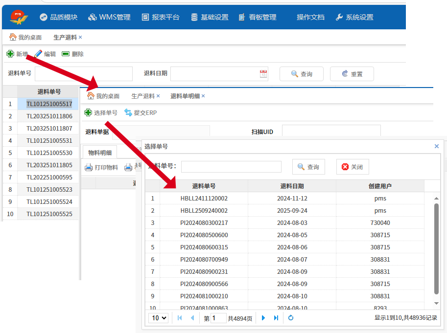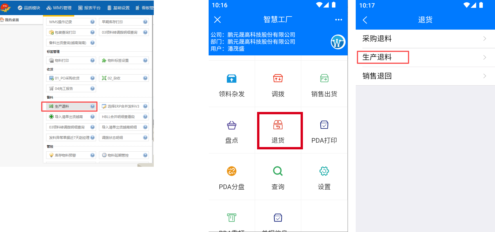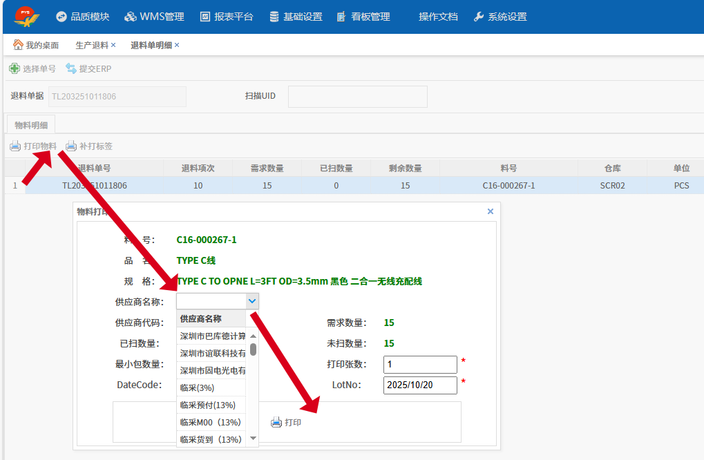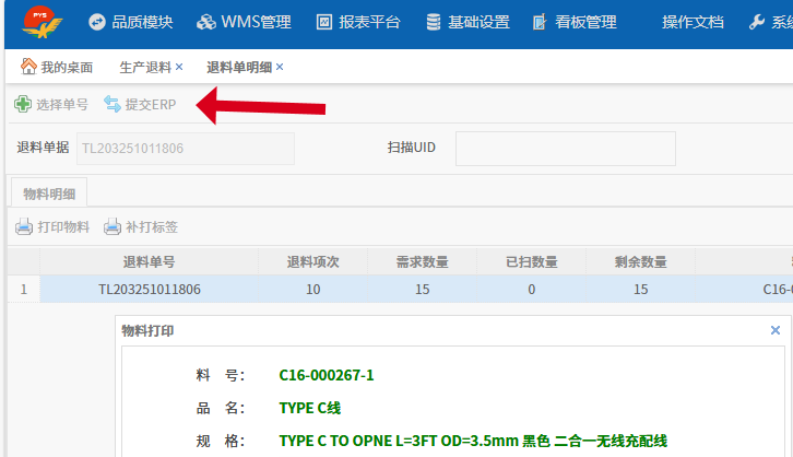 一、先在ERP上开具核准中的生产退料单 二、退料操作网页端和PDA端操作界面 网页端为选择同步ERP单据,打印标签 如果已经有标签 则可以通过PDA 扫码单据直接提交退货 电脑端操作方式通过新增获取新的生产退料单如果物料无标签的 通过打印功能打印标签贴在退货的物料上 打印完成后点击提交单据作者:潘茂盛 创建时间:2025-10-20 22:14最后编辑:潘茂盛 更新时间:2025-10-20 22:27
