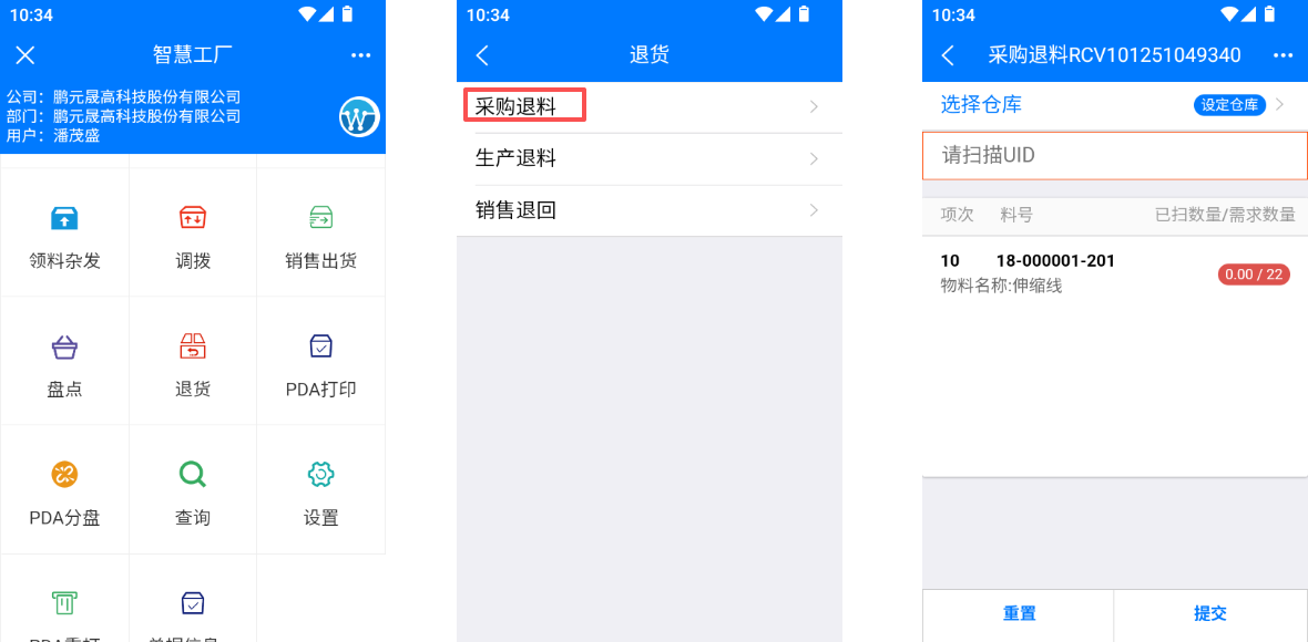仓库退货 原材料退供应商流程 在ERP上开局 审核中的退料单WMS在PDA上获取对应的退料单 扫描完成标签后提交ERP完成退货并审核ERP单据需要注意 退回供应商的物料 来源必须是该供应商作者:潘茂盛 创建时间:2025-10-20 22:32最后编辑:潘茂盛 更新时间:2025-10-20 22:36
