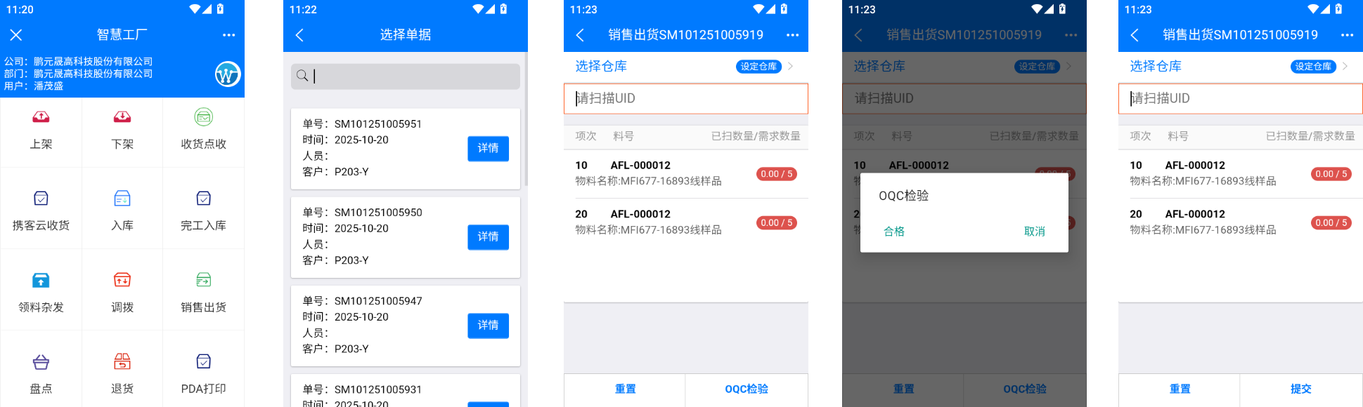 流程在EPR上创建核准中的出货单WMS 在PDA上获取单据并扫描出货 1 进入销售出货2 扫描选择单据3 扫描物料核对如果物料超过需求数量 ,请先进行拆箱操作4 物料扫描完成后 需要联系OQC人员确认外观并点击确认合格5 OQC确认后 交由仓库提交单据审核完成单据作者:潘茂盛 创建时间:2025-10-20 23:19最后编辑:潘茂盛 更新时间:2025-10-20 23:27